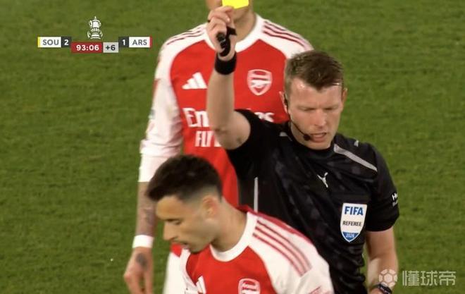 马丁内利迅速跑向事发地点,想要快发任意球。他推开了巴罗特并抢下皮球,试图尽快重新开始比赛。这位主裁判颇为震惊,鸣哨后向这名阿森纳前锋出示了黄牌。